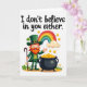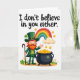 This greeting card features a cheerful leprechaun with a ruddy beard and a wide grin, dressed in a green suit and a tall buckled hat marked with a shamrock ☘️. He stands on a white background and leans on a cane, his open gesture aimed toward a large black pot overflowing with gold coins that seem to glint with tiny shamrock marks. A rainbow 🌈 arches above, guiding your eye to a soft cloud where more coins spill downward like a sparkling shower. The leprechaun’s friendly, teasing expression feels like a wink shared between close friends, as if he’s in on the joke with the person holding the card. Across the top, the line “I don’t believe in you either” sits in dark lettering, centered and easy to read against the pale space. The greens and golds stand out strongly against the white, while the rainbow adds bands of red, orange, yellow, blue, and purple. The final detail is the coin cascade falling from the cloud in a loose trail toward the pot’s open rim.