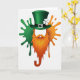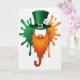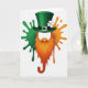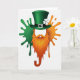 This design shows an abstract leprechaun portrait centered on the card, with an emerald green top hat crowned by a white four-leaf clover ☘️. Beneath the hat, a thick cascade of fiery orange beard and mustache fills the middle, shaped in a way that feels like a friendly grin. On the left side, glossy green paint splatters fan outward, while on the right, matching orange splatters balance the scene, like two companions leaning in from either side 💚. Soft shading along the hat brim and through the beard adds depth, giving the graphic shapes a gently rounded look. A small russet pipe curls up from the lower edge of the beard, adding a classic touch without crowding the main figure. There’s no headline across the top; any text is kept minimal and would sit low on the card in green to stay out of the artwork’s way. The background remains bright and open, letting the centered hat, clover, and mirrored splashes stand out clearly.