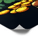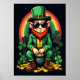 A leprechaun with a mischievous grin, sporting a green top hat and sunglasses, sits atop a pile of gold coins. He clutches a pot overflowing with gold, surrounded by four-leaf clovers and a rainbow arching overhead.