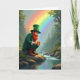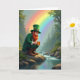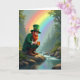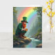 This design shows a thoughtful leprechaun sitting on a mossy rock along a rushing riverbank, dressed in an emerald suit with a shamrock on his hat and a bright orange beard that draws your eye. He holds a foaming tankard of golden ale close to his chest, and the warm glow on his hands feels like a small, shared secret between friends. Behind him, a wide rainbow stretches across the sky 🌈, spilling color into the water where the pools catch soft reflections. The river skips over rounded stones, and thick green trees lean in from both sides as their leaves fade into a light mist deeper in the background 💚. His knit sweater texture and sturdy boots add weight and realism, while his calm gaze toward the hazy horizon gives the scene a gentle, affectionate quiet. Along the top edge, the greeting text sits centered in light green, standing out against the darker sky and mist. Near the lower right corner, small accent lettering in gold echoes the ale’s shine beside the river’s reflective stones.