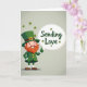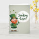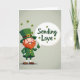 This card features a cheerful leprechaun front and center, dressed in an emerald green suit and tall top hat with shiny gold buckles, standing against a soft greenish‑gray gradient background. His reddish‑orange beard and rosy cheeks stand out warmly, and his big smile feels like a friendly wink shared between close friends 💚. One hand is lifted in a confident thumbs‑up, adding an easy, inviting energy to the scene. To his right, a white speech bubble floats near his shoulder with the words “Sending Love” placed in flowing green lettering. Small shamrocks dot around the bubble like confetti, reinforcing the affectionate, lucky tone ☘️. A few more shamrocks drift across the open background, giving the layout breathing room while keeping the focus on the character. The shading on his jacket, hat brim, and buckles adds depth, and the scattered clovers appear in slightly different sizes around him.
