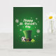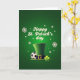 This St. Patrick's Day card features a deep emerald leprechaun hat filling the lower third, shaded in forest greens with a dark band and a golden buckle that catches the light. Tucked to the left is a classic black-and-white soccer ball, like it’s been set there by a close friend ready for a friendly match after the parade. On the right, a fresh green shamrock rests on the brim, its three leaves angled as if leaning in toward the hat with a gentle, affectionate closeness ☘️. Across the upper half, the words “Happy St. Patrick’s Day” sit centered in creamy off-white lettering, standing out clearly against the green background. A faint shadow behind the letters gives them a slight lift without overpowering the scene. White starbursts, diamonds, and small circular confetti scatter around the text and objects, adding little sparkles of celebration 💚. Behind everything, a smooth green gradient fades from lighter at the top to deeper at the bottom, with the white shapes sprinkled most densely near the center.