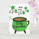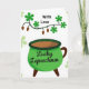 This card shows a large green leprechaun pot filling the lower part of the design, with a darker green rim and handle and a pool of warm brown “gold” or brew inside. Across the front of the pot, the title “Lucky Leprechaun” is written in a flowing dark green style that curves with the pot’s rounded shape. Above it, a curling green vine stretches across the top, dotted with shamrocks that lean toward each other like close friends sharing a quiet joke 💚. Tucked into the vine, the words “With Love” sit near the upper center in a rich green tone, as if the message is being held gently by the leaves. Small brown teardrop pods hang among the shamrocks, adding an earthy contrast to all the green ☘️. The background stays bright white, keeping the pot and greenery crisp and easy to notice. Faint, pale shamrock shapes float around the edges, like soft shadows scattered in the corners.
