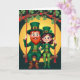 This card shows two cheerful leprechaun-like figures cuddled close on a rustic wooden swing, their fingers linked as they lean into each other with easy affection 💚. The swing hangs from a sturdy tree branch by deep red ropes, and the pair sit side by side as if sharing a quiet joke. He has a fiery red beard, a tall green top hat with a gold buckle, and a protective posture turned slightly toward her. She wears a matching green outfit with a smaller green hat marked by a tiny shamrock, plus a neat bow tie that adds a sweet touch ☘️. Behind them, a large glowing golden orb fills the background, lighting the scene against a dark green twilight. Above, the branch is decorated with clusters of four-leaf clovers, with small red hearts dangling among the leaves. The title text sits near the top in green lettering, while the warm gold glow frames the swing and the red ropes stand out against the shaded canopy.