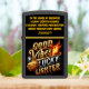 A striking lighter design bursts with energy and creativity, featuring bold golden lettering that spells out Good Vibes alongside a vibrant flame. The artistic elements create a sense of excitement amid a dark backdrop, inspiring positivity and fun.