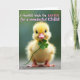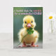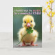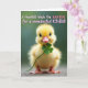 This greeting card features a fluffy yellow baby bird centered near the bottom, facing forward with large glossy dark eyes that feel like a friendly gaze meant just for you 🐰. Its soft golden feathers are shaded with gentle highlights, and a small pink beak and matching webbed feet add a sweet, tender touch. Held lightly in its beak is a bright green four-leaf clover, like a little offering shared between close friends or sweethearts. Behind the bird, the background fades into a softly blurred field of greens that suggests springtime grass without sharp details 🌷. The lighting is diffused and warm, giving the scene a calm, affectionate look as if the moment is being quietly shared. Near the top, a short Easter message appears in soft pink lettering, centered above the illustration and easy to spot. The clover’s rich emerald tone stands out against the yellow plumage, while the green backdrop stays muted and out of focus. The final detail is the tiny clover stem angled slightly upward from the bird’s beak, pointing toward the pink text above.