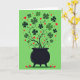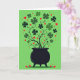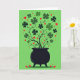 This design shows a stout, glossy black cauldron sitting along the bottom edge, with a soft shadow underneath to anchor it. From the opening, curling black vines rise and spread like an embrace, carrying clusters of four-leaf clovers in many greens, from deep forest to bright emerald 💚. Small red hearts tuck against the vines and hover nearby, as if they’ve drifted up together after being dropped in side by side. A few more hearts rest near the cauldron’s base, hinting at a shared stash of affection that’s spilling out. The background is a bright lime green, making the dark cauldron and the green shamrocks stand out sharply, with ☘️ shapes scattered throughout the upward flow. Any greeting text sits near the top in black, leaving the cauldron and the climbing clovers to fill most of the space. The vines curl into loops and tendrils, with hearts and shamrocks floating across the lime field above the cauldron.