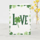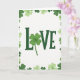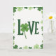 On the front of the card the word “LOVE” sits centered in deep emerald green, with the “O” replaced by a four-leaf clover ☘️ whose thin stem drops neatly below the letters. The “L,” “V,” and “E” use a sturdy, slightly rounded serif style that feels steady and affectionate, like a close friend’s reassuring hand. Around the edges, small clovers scatter into a loose border, mixing three-leaf shamrocks and extra four-leaf finds in shades from lime to sage 💚. The clovers have a soft, watercolor look with gentle see-through areas, so the border feels light rather than heavy. The background is bright white, making the greens stand out and giving the whole layout an airy springtime setting. The text stays in the middle with plenty of breathing room, while the clover border sits near the margins to frame it without crowding. A few clovers tilt at different angles, with varying sizes and soft edges, creating a drifting ring of green around the central word.