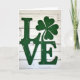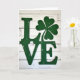 This design shows the word “LOVE” set large in the center, painted in deep emerald green 💚 against a weathered, whitewashed wood background. The “O” is replaced by a four-leaf clover ☘️, shaped like a neat cutout that feels like a lucky token tucked into the message. The tall letters sit close together, as if leaning in, giving the layout a cozy, affectionate closeness that reads like a quiet promise between two people. Soft, diffused light falls across the surface, bringing out gentle shadows along the edges and making the paint look slightly raised and touchable. The green finish is intentionally worn, with faint brush marks and tiny chips that reveal darker tones underneath, like something cherished and handled over time. Behind the lettering, horizontal wood planks show pale grain lines, small dents, and uneven white paint that adds rustic texture. The text is entirely uppercase and centered, with the clover “O” matching the same green as the other letters. The background boards run left to right, with subtle cracks and streaks in the white paint visible between the planks.