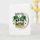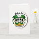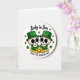 This card features a circular emblem on a white background with a soft gray shadow, like a sticker resting on the page. In the center, two cartoon skeletons stand close together, their big black eye sockets and small grins giving them a friendly, flirty look toward the viewer. Each wears a green top hat, and one hat has a gold buckle that catches the eye right away. Emerald cloaks drape over their shoulders and spill down into a pile of gold coins between them, suggesting they’re sharing the treasure as a pair 💚. Small green shamrocks float around the scene, adding extra St. Patrick’s Day flair ☘️. The words “Lucky in Love” curve across the top in green, while “Happy St. Patrick’s Day” curves along the bottom in black, framing the couple. Black outlines define the characters and details, with rich greens and bright gold standing out against the white space.