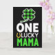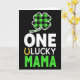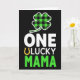This card features a large four-leaf clover at the top, filled with a lime-green and black buffalo plaid pattern and edged with a bright white outline against a deep black background ☘️. The clover sits like a lucky emblem above the message, setting a cozy, close-to-the-heart tone that feels like a proud hug from someone you adore. Centered below it, the text reads “ONE LUCKY MAMA” in stacked lines, with “ONE” in big white capital letters and “LUCKY” in matching white just beneath. In “LUCKY,” the “U” is replaced by a small golden horseshoe with tiny nail holes, adding a warm pop of yellow that feels like a sweet wink between friends 💚. The word “MAMA” anchors the bottom line in bright lime green, echoing the clover’s color and tying the whole layout together. Everything is crisply arranged and easy to read, with high contrast that makes the shapes and letters stand out sharply. The upper half is dominated by the plaid clover, while the lower half is neatly balanced by the three-line text centered on the black field. The lime green “MAMA” sits at the bottom under the white “LUCKY,” with the gold horseshoe tucked right where the “U” would be.