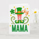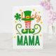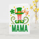 This card features a crisp white background with a tall green top hat that blends into red-and-white striped stockings, like a jaunty leprechaun outfit dressed up for St. Patrick’s Day 💚. The hat has an orange band and a square yellow buckle, and the stockings step into curled-toe green shoes with matching yellow buckles that seem to tiptoe toward someone special. To the left, a four-leaf clover sits like a quiet little good-luck token you’d tuck into a note for a friend or a favorite mama ☘️. Curving green tendrils curl around the central outfit, giving the scene a gentle, wrapping-around feel, like an affectionate arm. Near the top, the word “Lucky” appears in orange, arcing above the design and drawing your eye downward. Below the outfit, “MAMA” is set in solid green letters, centered and strong against the white. Small yellow dots are scattered throughout like coin-like confetti, and the green, orange, red, and yellow details stand out sharply on the bright white field. On the left side, the clover is framed by those curling green tendrils and dotted yellow circles.