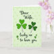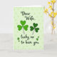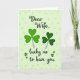 This design shows a pale lime-green background with faint, ghosted shamrock shapes that add soft texture without crowding the scene. Centered on the front, the message reads “Dear Wife. lucky me to have you,” set in dark green lettering that contrasts clearly against the light backdrop. Two large shamrocks anchor the layout, one in a bright emerald green and the other in a deeper forest green, like a pair leaning close in a quiet, affectionate moment ☘️. Gentle shading gives each heart-shaped leaf a rounded, natural look, and thin white stems curl downward with a light, airy touch. The greens move from light to dark across the card, creating a cozy St. Patrick’s Day palette that feels friendly and romantic 💚. The text sits between and slightly above the shamrocks, keeping your eyes in the middle before drifting down to the leaves. Behind everything, the faded shamrock pattern repeats in lighter green tones, forming a calm backdrop around the darker central message and the two main clovers.