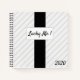 The front of this notebook has a gray and white pinstripe background with a narrow black strip down the middle. In the center of the black strip is a white box with a black border with the words"Lucky Me" written in classic black font. The back of the book has a continuation of the gray and white pin stripes. In the lower right-hand corner is the year 2020. There are ruled pages in this example, but you have a wide variety of choices for the kind of pages you want (blank, graph paper, wide rule, etc.). You can also change the spiral binding color and the size of the notebook.