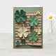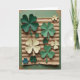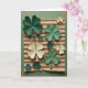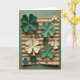 This card features an artful still life of metallic clovers and shamrocks scattered across a warm beige, horizontally ribbed corrugated panel, with a muted earthy-green background washed with touches of coppery patina. Larger four-leaf shapes sit near the center like small tokens exchanged between close friends, while petite three-leaf cutouts drift around them as if drawn into the same quiet moment 💚. Deep forest green leaves mix with creamy ivory ones that catch the light, and a single soft blue clover stands out like a private wink in the arrangement ☘️. The paint looks gently worn, with tiny chips and speckles that make each piece feel kept and revisited over time. The lower edge of the corrugated panel appears slightly torn, adding a natural, found-object feel to the setting. The St. Patrick’s Day greeting text is placed near the top in a medium green, with a smaller line beneath it in a lighter green that echoes the background wash. Behind everything, the broader backdrop stays softly mottled in green and oxidized copper tones, framing the clustered clovers against the ribbed texture.