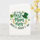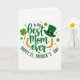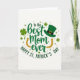 The front design shows a white background with “to the best Mom ever” centered in a flowing green line of text, giving it a tender, close-to-the-heart feel 💚. Just below, “HAPPY ST. PATRICK’S DAY” curves in a neat arc, also in green, anchoring the middle of the card. A green leprechaun hat with a black band and a gold buckle sits in the upper right, angled like it was just tipped in greeting ☘️. On the left side, a classic three-leaf shamrock balances the layout, adding a gentle nod to luck and spring. Two gold horseshoes sit to either side of the “Mom ever” words, framing that phrase like a warm hug. Small gold dots line the inside curves of the horseshoes, like tiny glints catching the light. Scattered across the space are little green asterisk-like marks and gold starburst shapes, giving the design a light, celebratory sparkle. The greens and golds stand out sharply against the white, with the hat, shamrock, horseshoes, and starbursts spaced evenly around the centered text.