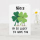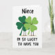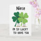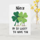 This card shows a white background with two smiling shamrocks in two shades of green, standing close like best friends sharing a quiet, affectionate moment 💚. The left shamrock is a deeper emerald and leans in, its leaf “arm” gently wrapping around the lighter lime shamrock as they grin at each other with round black eyes and soft rosy cheeks. Their thin black stick legs rest on a small beige oval patch beneath them, like a little stage that keeps the scene grounded. At the top, the word “Niece” sits centered in a rounded black font, easy to spot right away. Under the shamrocks, the message “I’M SO LUCKY TO HAVE YOU” appears in matching rounded black letters, spaced neatly across the lower area. The simple faces and close pose suggest an easy closeness, like a warm hug shared on St. Patrick’s Day ☘️. The two greens—deep emerald and bright lime—stand out crisply against the white space, keeping all attention on the pair. A soft beige oval sits under their feet, with the taller emerald shamrock on the left and the lighter lime shamrock on the right.