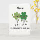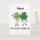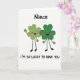 This greeting card shows two smiling four-leaf clovers centered on a bright white background, leaning toward each other like close friends sharing a private joke 💚. The clover on the left is a light lime green and lifts one arm in a small wave, with a soft shadow that gives it a slightly rounded look. On the right, a deeper emerald clover stands nearby, the pair close enough to suggest an easy, affectionate bond ☘️. Both have tiny black dot eyes, open grins with a touch of red inside the mouth, and pink cheeks that make their expressions look warm and a little bashful. Thin black arms and legs with simple outlined hands keep the characters neat and easy to read. The word “Niece” sits at the top in black lettering, while “I’M SO LUCKY TO HAVE YOU” appears below the clovers in matching black, centered and spaced for balance. The two green clovers, one lighter and one darker, stand side by side with their slender black limbs against the open white space.