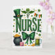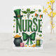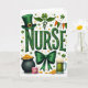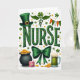 Designed with a St. Patrick’s Day theme, the illustration centers on the large word “NURSE” in plaid green, dotted with small golden shamrocks and tiny blossoms 💚. Resting on top of the letters is a green leprechaun hat with a gold buckle, like it’s perched there with a fond, proud little tilt. Near the main word, a medical caduceus is worked in alongside a four-leaf clover, pairing care and luck in one close-knit symbol. In the upper right, Irish flag bunting stretches diagonally, adding a gentle sense of movement against the white background ☘️. The lighting stays soft and even, letting the greens and warm golds stand out without harsh shadows, and the main text sits clearly in the middle of the card. Below the lettering, a black pot spills gold coins beside a silky green bow, with a small line of extra coins scattered nearby. Off to one side sits a pink container and a frothy mug of green beer, while more shamrocks and golden flowers are sprinkled around the edges.