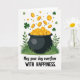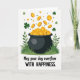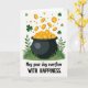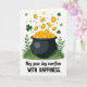 The front design shows a glossy black cauldron centered on a white background, set into tufts of green grass and leafy sprigs at the base. From the open pot, a stream of golden coins rises and spills outward, many stamped with an “S,” like a generous shower that feels happily shared between friends 💚. Small three-leaf shamrocks and scattered green dots float near the top, adding a light, easy charm ☘️. The greens range from soft to deep, while the gold coins gleam against the dark pot, creating a strong contrast that draws your eye upward with the motion. Beneath the illustration, the message “May your day overflow WITH HAPPINESS” sits centered, with “May your day overflow” in a darker green and “WITH HAPPINESS” in matching green, set a bit heavier for emphasis. The upward swirl of coins and drifting shamrocks suggests a warm, inviting exchange, like someone quietly wishing you more good moments than you can hold. Near the upper edge, the shamrocks and tiny green dots are spaced loosely across the white area above the pot.