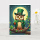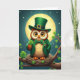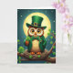 The front design shows an anthropomorphic owl perched in a rustic nest on a sturdy branch, set against a night sky that feels like a quiet date under the stars 💚. It wears an emerald green top hat with a golden buckle, a matching jacket, and a neat bow tie, giving it a dressed-up St. Patrick’s Day look. In one outstretched wing, the owl holds a four-leaf clover ☘️, echoing the small shamrocks scattered along nearby branches like little tokens left for someone special. A large full moon glows in warm gold behind it, lighting the nest and bark with soft highlights against the deep teal sky. The owl’s wide golden eyes, rimmed with white feathers, look straight ahead with a tender, attentive focus that suggests closeness and care. Any greeting text sits near the top in light gold lettering, with a smaller line near the bottom in pale green to match the outfit. Tiny stars speckle the background, and the moon’s halo fades gently into the teal sky around the owl and its nest.