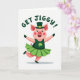 This card shows a cheerful piglet dancing on a bright white background, dressed for St. Patrick’s Day in a deep emerald top with a four-leaf clover, a lighter jade pleated skirt, and a leprechaun hat with a golden buckle ☘️. Its rosy pink skin and red-blushed cheeks stand out against all the greens, and the wide smile and shining eyes feel like it’s inviting a friend to join in. With arms stretched outward and one leg kicked up, the pose suggests a carefree moment you’d share with someone close 💚. Above the pig, the words “GET JIGGY!” curve across the top in dark green letters, centered like a headline. The lettering sits high and open, leaving plenty of white space around the character so the motion feels even bigger. A soft gray shadow under the pig adds a little depth while keeping the overall look simple and airy. The clover on the shirt is centered on the chest, and the hat tilts slightly as if it’s bouncing with the dance.