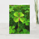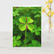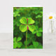 This design shows a close-up of a clover-like plant centered in the frame, its four lime-green leaves spread evenly like a small green embrace 💚. Each leaf has faint veins and a soft, velvety edge, as if the plant is dressed for a quiet date with the camera. Where the leaves meet, a deep maroon cross-shaped mark draws the eye, like a shared secret at the heart of the greenery ☘️. The background fades into a gentle green blur with hints of other plants, setting a calm meadow-like scene without stealing attention from the main sprig. Soft, diffused light makes the leaf surfaces glow and keeps the shadows smooth, adding to the tender, unhurried mood. There’s no printed text anywhere on the front—no headline at the top, no message at the bottom, and no lettering layered over the leaves. The only strong contrast is the rich maroon center against the luminous green leaves, with the rest of the backdrop melting into muted green shapes.