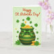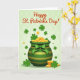 This greeting card centers on a rounded pot of gold decorated with emerald and lime-green stripes, topped with a polka-dotted bow that feels like a sweet little gift between friends 💚. Gold coins spill from the rim in a tumbling stream, with a few pieces floating midair as if they were just tossed with a teasing, lucky flourish. The background is a pale, softly glowing green with a subtle diamond grid texture that reads like quilted fabric or stained glass. Across that backdrop, three-leaf shamrocks and a few four-leaf clovers drift around the pot, giving the scene a gentle, celebratory swirl ☘️. Some coins carry a faint tiny carrot imprint, a quirky detail that makes the treasure feel like it has its own secret story. The words “Happy St. Patrick’s Day!” sit at the top in a warm red-orange, standing out clearly against the light green field. The pot’s curved stripes, dotted bow, and the scattered clovers fill the page, with the brightest highlights glinting off the coin edges near the center.