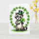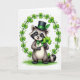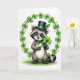 This card features a friendly, humanlike raccoon standing on a small patch of green grass against a bright white background, giving the scene lots of open space. Its fur is warm gray and creamy white, with the classic dark mask around big, shining eyes and a smile that feels like it’s meant for someone special. A black top hat sits on its head with an emerald-green band and a matching feather, and a neat green bow tie adds a dressed-up touch 💚. In its small, gloved paws, the raccoon holds an oversized four-leaf clover, angled forward as if offering it to a close friend or sweetheart ☘️. Around the raccoon, a circular wreath of intertwined shamrock vines loops smoothly, dotted with round green accents that add depth. The St. Patrick’s Day greeting text sits near the top inside the wreath in green lettering, balanced by smaller matching text near the bottom. Fine shading defines the fur, the clover’s veins, and the individual blades of grass beneath its feet.