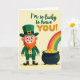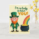 This greeting card shows a friendly leprechaun standing in the left foreground, dressed in a deep green top hat and matching suit with a light yellow vest and shiny black shoes with gold buckles. His rosy cheeks and bright orange beard frame a wide smile that feels like it’s aimed at someone special nearby, like an inside joke between friends. To his right sits a dark pot overflowing with gold coins, and the coins catch the light as if they’ve just been discovered ☘️. A rainbow arcs from the pot across a soft pale yellow background, adding bands of red, orange, yellow, green, blue, and purple 🌈. Near the top, the text “I’m so lucky to have YOU!” is centered in green lettering, with “YOU!” set apart in warm orange for extra emphasis. The simple shading and even lighting keep the focus on the leprechaun’s welcoming expression and the treasure at his side. The rainbow’s curve ends right at the rim of the pot, where the gold coins pile up in bright, rounded shapes.