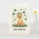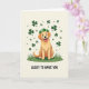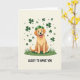 This card shows a smiling cartoon golden retriever in warm golden fur tones, sitting upright with a pink tongue hanging out and an eager, friendly gaze that feels like it’s meant for someone special 💚. A leafy green flower crown rests on its head, dotted with tiny white and yellow blossoms that soften the scene with a gentle, affectionate touch. The background is a creamy neutral shade, sprinkled with emerald shamrocks floating around the dog like confetti, giving the space a light, festive lift ☘️. The pup sits on a crescent patch of rich green grass, adding a grounded, outdoorsy base beneath the portrait. Near the bottom, the phrase “LUCKY TO HAVE YOU” is centered in dark lettering that stands out clearly against the pale background. The overall layout keeps the dog as the main focus while the shamrocks circle it in different sizes, like they’re drifting past in a slow breeze. The warm grin and bright eyes suggest the kind of close friendship or romance where a simple look says “I’m glad you’re here.” The shamrocks are scattered across the cream backdrop, with the dark text placed below the green grass curve.