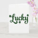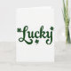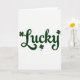 This card features the word “Lucky” centered on a bright white background, written in flowing emerald-green lettering that curls and loops with a romantic, almost handwritten grace 💚. The letters sweep across the middle like a gentle ribbon, giving the layout a soft sense of closeness, as if it’s meant to be shared between friends or sweethearts. The text sits as the main focus, with no border, letting the green stand out strongly against the white. A small three-leaf clover grows from the upper left of the capital “L,” its stem tucked into the letter’s curve like it belongs there. Another clover rests just below the “c,” adding a quiet little pause in the lower center area. A third clover floats above the tail end of the “y,” creating an airy touch near the top right ☘️. The overall look stays simple and open, with three green clovers placed around the word on the white field.