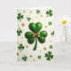This card features a large, three-dimensional shamrock centered on the front, with four plump, heart-shaped leaves in deep emerald green 💚. Each leaf is outlined with a thick band of gold glitter, and tiny round gold beads sit across the surface like little jewels, catching the light as you look closer. A textured golden bow is tied where the leaves meet, like a small gift placed there for someone you care about ☘️. The soft, diffused lighting makes the green look velvety and the gold details gleam, giving the scene a cozy, affectionate feel, like a quiet wink between close friends. Near the top, the St. Patrick’s Day message sits in gold lettering, spaced neatly so it doesn’t crowd the shamrock. The words are centered and easy to read against the lighter background, with the shine echoing the glitter outline. Behind the shamrock, the background fades into a gentle blur of smaller green clovers and scattered gold stars, like confetti floating across the page.