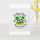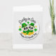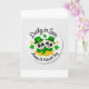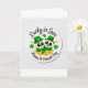 This card features a circular scene where two cartoon-style skeletons stand close together, their oversized black eyes and stitched smiles turned toward each other like they’re sharing a private joke. Each wears a green leprechaun hat with a gold buckle and a long emerald scarf that drapes down their chests, adding a cozy touch of friendship and romance 💚. At their feet sits a pile of gold coins, drawn with bright yellow-gold highlights, and small three-leaf shamrocks are scattered around them on a white background ☘️. A thin black ring frames the circle, keeping all the details neatly contained. The phrase “Lucky in Love” appears along the top curve in black lettering, while “Happy St. Patrick’s Day” follows the bottom curve in matching black text. Deep greens and warm gold tones stand out strongly against the white space, making the hats, scarves, coins, and shamrocks easy to spot. The coins cluster at the bottom center beneath their feet, with shamrocks sprinkled around the sides inside the circular border.