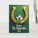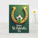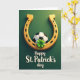 Designed with a golden horseshoe front and center, this St. Patrick’s Day illustration sets a friendly, romantic tone as the shining U-shape curves like an open embrace around the main icons. Inside the horseshoe sits a classic black-and-white soccer ball, angled slightly to one side as if it has just rolled in to join the celebration. Tucked nearby is a three-leaf shamrock in bright green ☘️, its soft texture contrasting with the smooth metallic glow of the horseshoe. The background is a deep emerald field with a gentle gradient, lighter near the top and darker toward the bottom, giving the scene a cozy evening feel. A small touch of warmth comes through in how closely the soccer ball and shamrock are placed, like two companions sharing the spotlight 💚. Along the bottom edge, the phrase “Happy St. Patrick’s day” appears in flowing white lettering, centered and easy to spot against the darker green. Highlights and shadows add depth to the metal, the ball’s panels, and the shamrock’s leaves, with the brightest gleam catching the upper curve of the horseshoe.