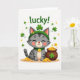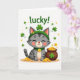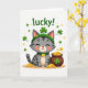 This card features a sweet grey tabby cat as the star of a St. Patrick’s Day scene, sitting calmly with closed eyes and soft pink blush on its cheeks 💚. The cat wears a green beret topped with a tiny gold shamrock and an emerald collar with a gold coin charm, like a small gift worn close to the heart. To the right, a rustic brown pot tips slightly as shiny gold coins pour out and scatter across the sandy ground, as if shared between close friends. The background stays white so the greens and golds stand out, keeping the focus on the cat and its treasure ☘️. Across the top, the word “lucky!” appears in rich green lettering, centered above the cat and easy to spot. Small green shamrocks and tiny gold starburst shapes float near the upper edge, adding a light, festive sprinkle. The coins glint in rounded shapes beside the pot while a few shamrocks drift overhead near the “lucky!” text.