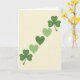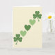 This card features a pale cream background with a gentle glow, and a diagonal layout that leads your eye from the bottom-left corner to the top-right. In those opposite corners sit two deep green shamrocks, each leaf filled with fine white line patterns that feel like careful tracing. Between them, three hearts line up along the same diagonal, like a small chain of affection linking the two shamrocks 💚. The middle heart is the darkest emerald, while the hearts on either side shift into lighter green shades, giving the trio a soft, growing-together look. There’s no character scene, but the way the hearts lean between the shamrocks reads like close friendship or a quiet romantic connection ☘️. Any wording would sit neatly along the diagonal in small white lettering, tucked near the hearts so it doesn’t crowd the corners. The final look is two patterned shamrocks framing three gradient green hearts on a creamy field, arranged from lower-left to upper-right.