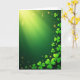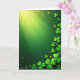 Designed with a flowing arrangement of shamrocks, the scene frames the right and lower edges with three-lobed leaves in several sizes, as if they’re drifting together in a gentle current ☘️. The greens shift from a bright lime glow in the upper left to a deep emerald in the lower right, giving the background a soft sense of depth. Warm golden rays spill diagonally across the center, and tiny bokeh-like specks sparkle like little meeting points where friends might linger a moment longer 💚. The shamrocks carry faint texture and light shadowing, so they feel slightly raised against the smooth gradient. There are no characters, but the way the leaves lean inward and overlap suggests a tender closeness, like two people walking shoulder to shoulder. Any greeting text would sit best in the open center-left area, set in small white or pale-gold lettering so it stays readable against the green glow. Along the edges, the shamrocks cluster most densely at the bottom right, with a few smaller leaves floating upward toward the brighter corner.
