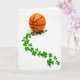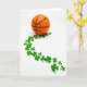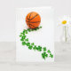 This greeting card features a small orange basketball near the top, its black seams and pebbled texture standing out against a bright white background. From beneath it, a diagonal trail of emerald shamrocks drifts downward like a gentle path leading you closer, adding a friendly, almost flirty sense of connection between sport and luck 💚. The clovers vary slightly in size and shape, and their heart-like leaves feel like little nods to affection without needing any characters on the scene. Lighting stays even and soft, with barely-there shadows that keep everything crisp and easy to take in. A short St. Patrick’s Day greeting sits near the lower portion in green lettering, leaving plenty of open white space around it. The message is centered and balanced so your eye moves from the basketball to the shamrock trail and then down to the words. The warm orange and cool green create a simple contrast, with the clovers forming a smooth curve across the white field ☘️. The basketball remains anchored at the top while the shamrocks sweep diagonally toward the bottom edge.