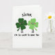 Designed with two smiling shamrock characters, this St. Patrick’s Day card features a deep emerald green clover standing close beside a lighter lime green clover on a bright white background. Their dot eyes and curved smiles face forward, and soft pink blush on their cheeks gives them a shy, affectionate look, as if they’re sharing a private joke. Each shamrock has thin, stick-like legs set in a jaunty stance that makes them look like they’re mid-step together. Centered near the top, the word “SISTER” appears in green lettering that feels friendly and casual. Near the bottom, “I’M SO LUCKY TO HAVE YOU” is placed in matching green text, neatly spaced under the characters. The open white space around them keeps the focus on their closeness and the lucky-clover theme ☘️💚. The two greens contrast gently, with the darker shamrock on one side and the lighter shamrock on the other, both framed by the simple white field.