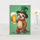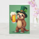 This design shows a cheerful anthropomorphic sloth centered on a deep green background, dressed for St. Patrick’s Day with an emerald top hat, a gold buckle, and a four-leaf clover pinned to the band ☘️. Its layered brown fur looks soft and textured, and the long claws have bright white tips that stand out against the green. The sloth’s wide smile and shining eyes feel like a friendly, flirty glance, as if it’s sharing a private joke with someone close 💚. In its raised right hand, it holds a tall glass of amber drink, tilted slightly like a toast meant for a buddy or a date. A thick, pale foam cap sits on top, and tiny bubbles sparkle through the golden liquid under gentle, diffused light. Any greeting text would sit neatly above the hat in light lettering, with a smaller line placed near the bottom in a matching pale tone. The hat’s clover is a bright green accent, and the glass catches highlights along its rim and sides.