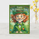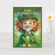 🍀A cheerful young girl dressed as a leprechaun beams with excitement, holding a beautifully wrapped golden gift. She wears a vibrant green outfit, complete with a top hat adorned with shamrocks, a bow tie, and golden buttons. The background captures a festive city scene with confetti in the air, enhancing the joyful spirit of St. Patrick’s Day. The image radiates luck, happiness, and celebration.✨