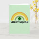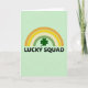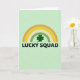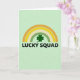 This card shows a muted rainbow arcing across a pale mint green background, setting a calm little scene that still feels festive ☘️. The rainbow bands move from warm ochre to mellow gold, then creamy off-white, and finally sage green, giving the design an earthy, cozy look. Tucked under the inner curve is a deep green four-leaf clover, like a small lucky token shared between close friends 💚. The clover sits centered beneath the rainbow, drawing your eye down the middle as if the two symbols are leaning toward each other. Underneath, the words “LUCKY SQUAD” appear in black, all caps, in a simple sans-serif style that feels steady and together. The text is placed near the lower portion of the front, leaving plenty of open mint space above for the rainbow to breathe. The overall layout is neatly balanced with generous spacing around the main elements. The corners are softly rounded, and the clover’s rich green stands out against the mint field.