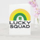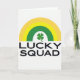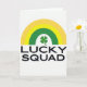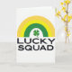 This greeting card features a simple St. Patrick’s Day scene on a bright white background, with a rainbow arc stretching across the top. The arc is split into three bands, starting with soft goldenrod on the outside, moving to sunny yellow, and finishing with deep emerald green on the inside. Tucked under that green curve sits a neat four-leaf clover in a slightly lighter green, its small stem pointing downward like it’s reaching toward someone close by ☘️. The open white space around the clover gives it room to stand out, like a quiet sign of shared luck between friends. Near the bottom, the words “LUCKY SQUAD” are set in black, all caps, arranged across two lines, centered and easy to spot. The strong lettering feels like a group nickname you’d wear proudly, while the green-and-gold palette keeps the mood warm and friendly 💚. Above the text, the clover remains the main focal point, framed by the curved emerald band and the wide white space.