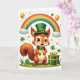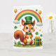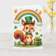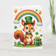 This card shows an anthropomorphic squirrel front and center, wearing an emerald-green leprechaun hat with a gold buckle and a matching green bead necklace 💚. Its reddish-brown fur and creamy belly are shaded smoothly, and its wide, shining eyes and rosy cheeks give it a sweet, friendly look, like it’s sharing a private joke with someone close. A rainbow 🌈 arches across the upper background with soft, rounded clouds, while two golden balloons hover nearby as if tugging upward on invisible strings. The ground is a field of green grass dotted with shamrocks and scattered gold coins, adding a little sparkle around the squirrel’s feet. On the right side sits an emerald-green gift box with a bright gold bow, angled slightly as if it’s been set down for a special friend. The St. Patrick’s Day greeting text is placed near the top in green lettering, standing out clearly against the white background. The overall layout keeps the squirrel as the focal point, with the rainbow and balloons framing it above and the coins and gift box balancing the scene below. In the background, the white space stays open and airy so the rainbow, clouds, coins, and green accents remain easy to see.