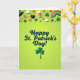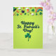 This card opens on a lime-green background with a soft gradient that gives the scene extra depth. Centered in the middle, the words “Happy St. Patrick’s Day!” appear in dark green lettering with a faint emerald glow, making the greeting easy to spot. Above the text, a festive crest of icons sits close together like friends leaning in for a photo: a leprechaun’s top hat, a pot spilling gold coins, a foamy mug of ale, and an orange horseshoe. Small shamrocks in varied greens and touches of orange are scattered around them, adding a flirty, celebratory sparkle 💚. On the right side, a rainbow arcs upward, balancing the cluster with a bright sweep of color 🌈. The icons have a slightly raised, 3D look with gentle shading, as if you could trace their edges with your fingertip. Below the main words, a single larger three-leaf clover rests near the bottom, darker and shadowed so it stands out against the green backdrop.
