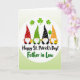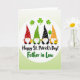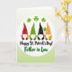 A warm message of St. Patrick’s Day comes to life with four gnomes standing shoulder to shoulder, their long white beards brushing against their coats as if they’ve leaned in close like old friends. Each one wears a tall cone hat with its own pattern and color—red with white dots, green with dots and a faint Celtic-style curl, black with white speckles, and orange with stripes—set against a light green background that keeps the scene airy and bright 💚. Above their heads, three lime-green shamrocks float like lucky confetti, spaced evenly to balance the lineup ☘️. One gnome lifts a golden tankard, another holds a green balloon that rises slightly higher than the hats, and a third cradles a small shiny pot as though sharing a secret treasure. Centered beneath the characters, the line “Happy St. Patrick’s Day!” appears in black, with “Father in Law” placed just below it in emerald green. The text sits comfortably under the gnomes, leaving enough breathing room so the figures stay the main focus. Everything is contained inside a soft-edged white circle vignette that stands out gently from the pale green gradient behind it.