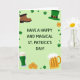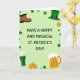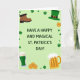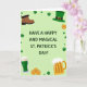The front design shows a pastel green background with dark emerald lettering in the middle that reads “HAVE A HAPPY AND MAGICAL ST. PATRICK’S DAY!” 💚. The message sits centered and large, like it’s inviting two friends to lean in and read it together. In the upper left, a brown leprechaun boot angles inward, and in the upper right, an emerald top hat with a gold buckle tilts as if tipping hello. Small three- and four-leaf shamrocks are scattered around the text, adding little pauses of green that guide your eye across the card ☘️. Along the bottom, a clear glass of glowing green beer with white foam stands near a ribbed golden beer stein, both placed close enough to feel like a shared toast. Gold coins are dotted between the mugs and clovers, catching the light against the soft backdrop. The hat’s buckle shines in warm gold, and the froth on both drinks is bright white against the greens and golds.