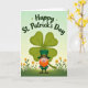 This St. Patrick's Day card features a smiling leprechaun front and center, with bright blue eyes and a friendly expression that feels like he’s sharing a little inside joke with you 💚. He wears a classic green suit and a tall green hat with a shiny buckle, while his orange beard adds a cozy contrast that draws you closer. In the foreground, small orange, star-shaped flowers dot the green ground like tiny gifts scattered at his feet, adding a sweet, companionable touch to the scene. Behind him, a large four-leaf clover fills the background, its leaves softly shaded to give it depth and a gentle, lucky presence. The sky fades from mint green into a warm yellow glow, like early sunlight settling over a quiet celebration ☘️. The words “Happy St. Patrick’s Day” curve across the top of the design in deep green lettering, standing out clearly against the lighter sky. The composition keeps the leprechaun framed by the clover and the flowered grass, with green tones dominating and orange accents repeating in the beard and blossoms. The oversized clover sits behind his hat while the arched text floats above, leaving the leprechaun’s face unobstructed and easy to notice.