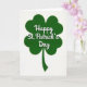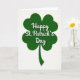 Designed with a classic St. Patrick’s Day look, the card centers on a large four-leaf clover in deep emerald green against a bright white background. The clover fills most of the space, its rounded leaves and softened edges suggesting a cut-paper shape resting on the page. Across the middle of the clover, the words “Happy St. Patrick’s Day” appear in white, flowing lettering that feels like a gentle note shared between friends 💚. A faint shadow behind the letters gives them a slight lift, as if the message is layered on top of the green shape. The simple two-color scene keeps attention on the clover and the greeting, like a quiet toast exchanged with a warm smile. With so much open white space around it, the green symbol stands out clearly, like a small lucky charm offered with care ☘️. The final view is a centered green clover on white, with white text placed right across its middle and a subtle drop shadow.